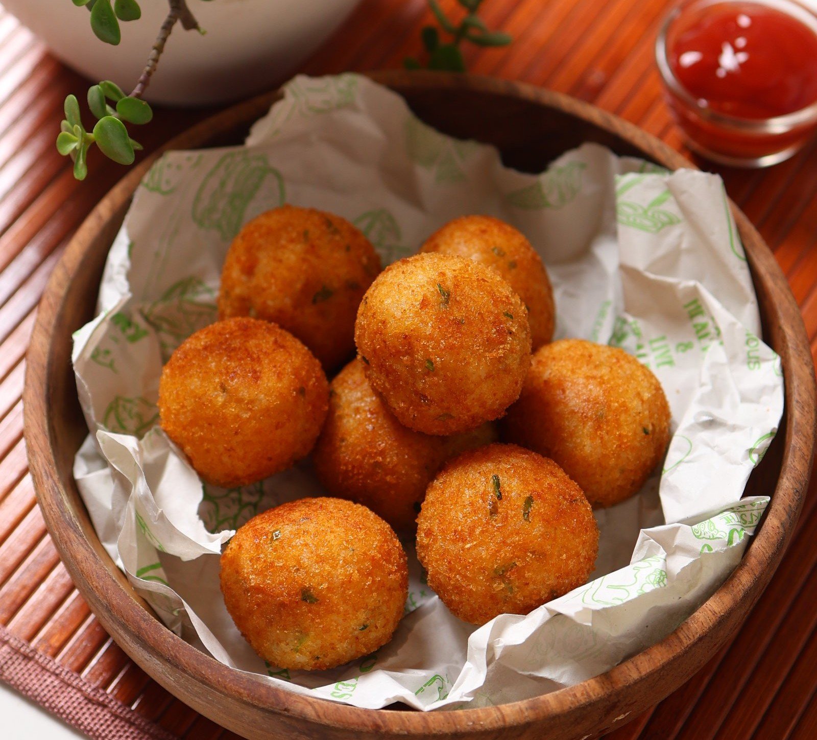 These snack bites are served hot and fresh, paired with a tangy dipping sauce that adds a zesty contrast to the crispy coating. Their neat, round presentation and uniform color make them visually appealing as well as delicious.